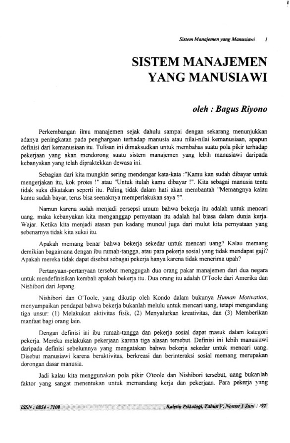 Perkembangan ilmu manajemen sejak dahulu sampai sekarang menunjukkan adanya peningkatan pada penghargaan terhadap manusia atau nilai-nilai kemanusiaan, apapun definisi dari kemanusiaan itu. Tulisan ini dimaksudkan untuk membahas suatu pola pikir terhadap pekerjaan yang akan mendorong suatu sistem manajemen yang lebih manusiawi daripada kebanyakan yang telah dipraktekkan dewasa ini.